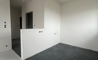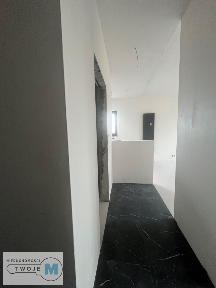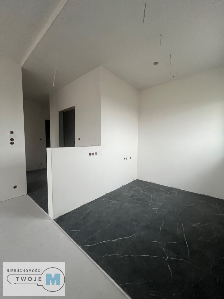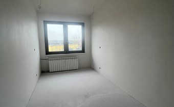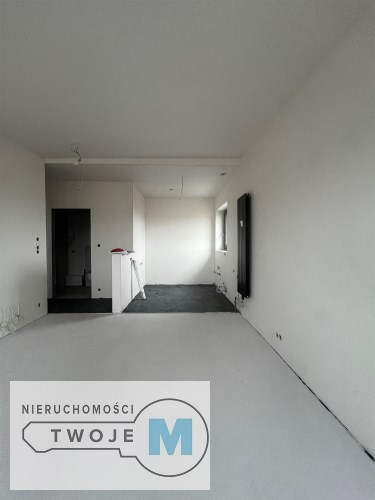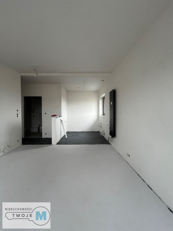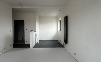 Mieszkanie w stanie częściowo wykończonym z dużymi przeszkleniami, które zapewniają dużo naturalnego światła.