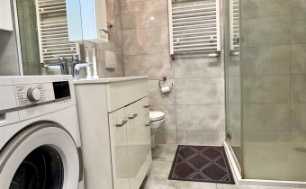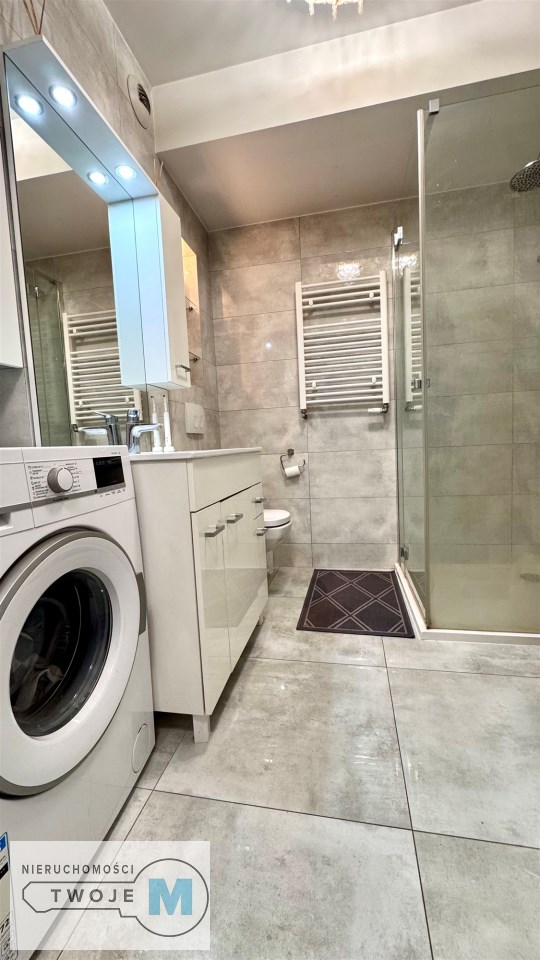 Wyposażona w kabinę prysznicową (deszczownica), w pralkę, zabudowę meblową.