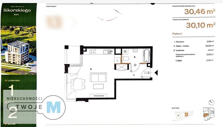 Do mieszkania przynależy balkon typu loggia o pow. 2,33 m2, a także miejsce postojowe w garażu podziemnym płatne dodatkowo 49 000 złotych.