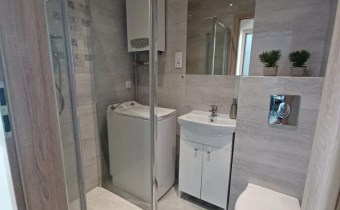 Wyposażenie łazienki kabina prysznicowa, lustro, pralka, prysznic, umywalka, WC