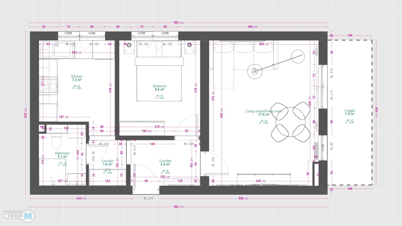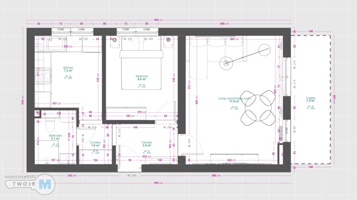 - duży, widny pokój dzienny/salon z wyjściem na balkon – 17.6 m2