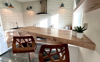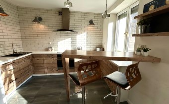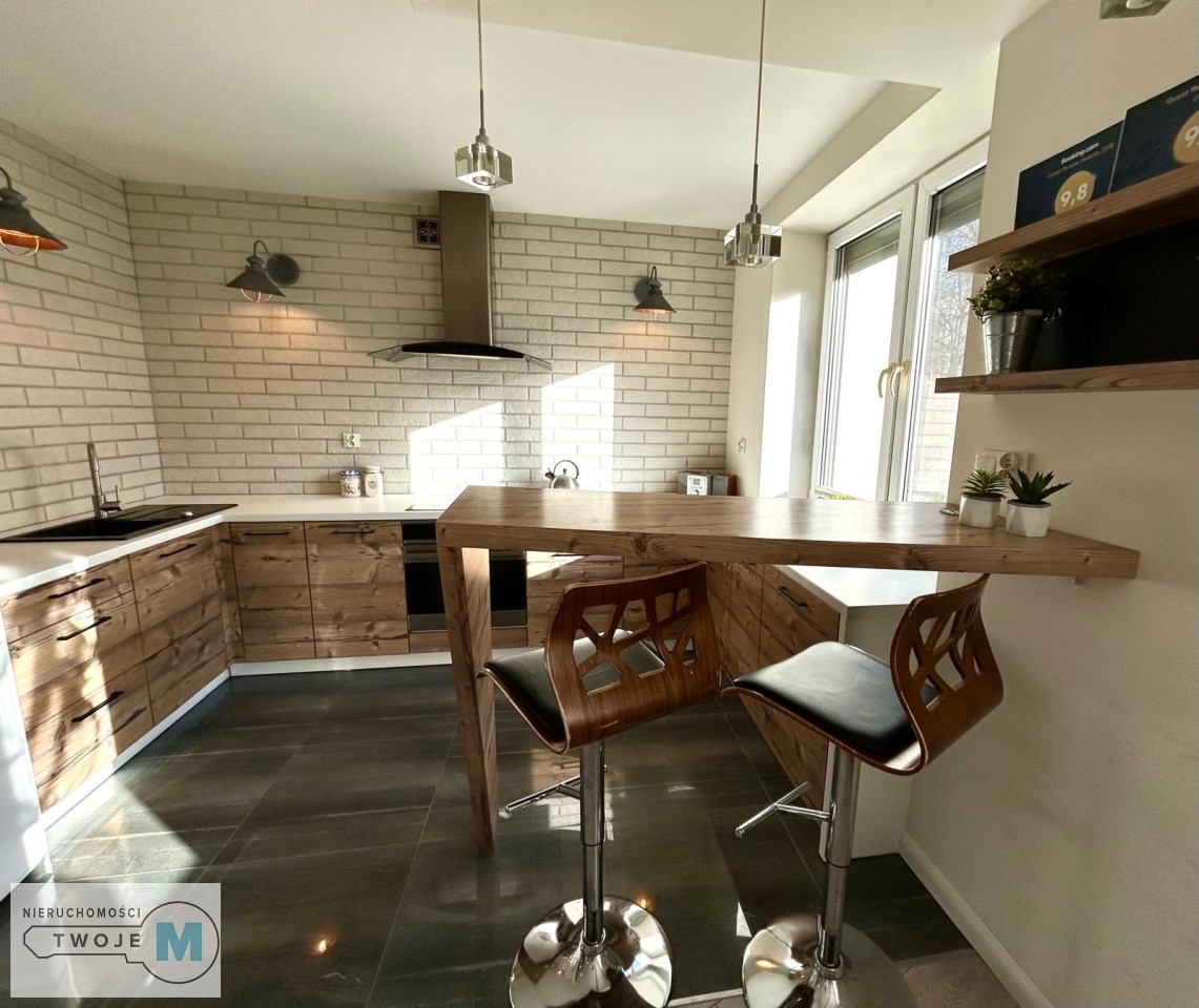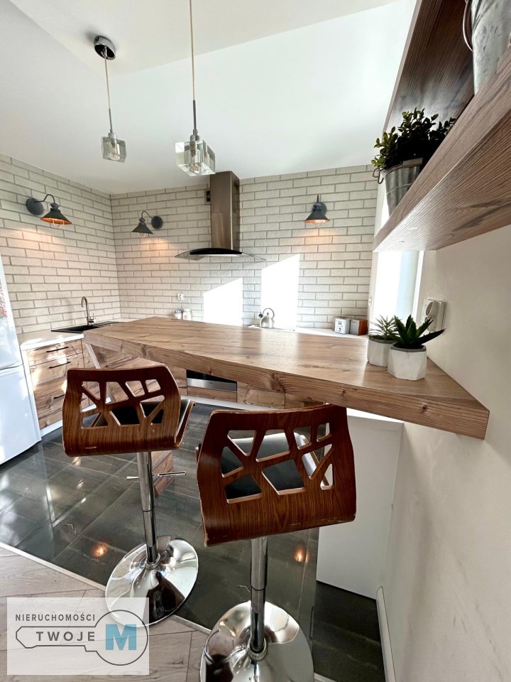 Aneks kuchenny wyposażony w sprzęt AGD (lodówka, piekarnik, płyta indukcyjna) oraz meble na zamówienie. Blat z dwoma hokerami idealnie oddziela część wypoczynkową, a nietuzinkowe lampy oraz odpowiednio dobrane płytki nadają szyku i elegancji.