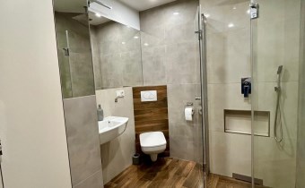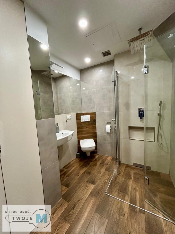 Wyposażona w kabinę prysznicową (deszczownica), w pralkę, zabudowę meblową.
