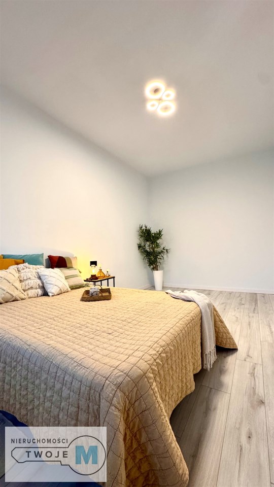 Mieszkanie po generalnym remoncie. Nowoczesny design, wysokiej jakości wykończenie. Nowoczesne oświetlenie LED (ścienne i sufitowe). W łazience zamontowano kabinę prysznicową oraz ogrzewanie podłogowe. Dużym atutem jest okno w łazience, które daje dużo światła dziennego. W kuchni został zainstalowany wysokiej klasy sprzęt AGD firmy BEKO tj. płyta gazowa, piekarnik, zmywarka. W zabudowie meblowej pozostawiono miejsce na pralkę oraz lodówkę. Na ścianie telewizyjnej w salonie została położona ozdobna biała cegła oraz został wykonany tunel na kable telewizyjne. W jednej z sypialni miejsce na dużą szafę na wymiar.
