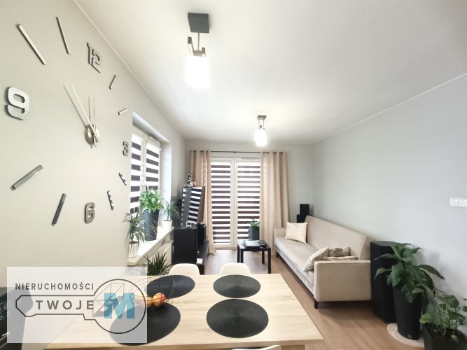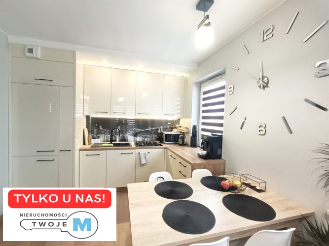 Mieszkanie gotowe do zamieszkania w pełni umeblowane oraz wyposażone. W kuchni meble wykonane na wymiar (wyposażona w sprzęty m.in. zmywarka, lodówka), w salonie rozkładana sofa, szafka RTV, oraz stół z krzesłami. W sypialni dwie szafy oraz łóżko.