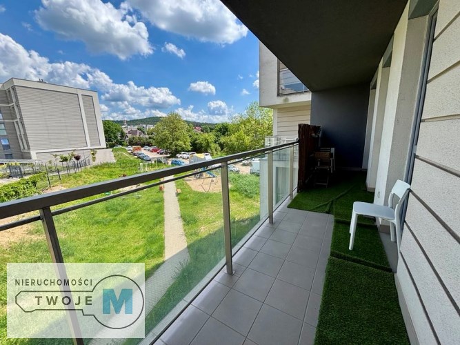 Przestronny salon wyposażony w wygodny narożnik, szafkę RTV oraz stołu z czterema krzesłami , z którego możemy wyjść na taras o powierzchni ok. 12m2. Połączony jest on także z otwartą kuchnią wyposażoną w niezbędny sprzęt AGD (lodówka, piekarnik, płyta grzewcza) oraz meble w zabudowie wykonane przez stolarza. Sypialnia jest ustawna, wyposażona w pojemną szafę na wymiar, łóżko. Łazienka wielkości ok. 4m2 z prysznicem, umywalką, WC. Do mieszkania wejdziemy przez funkcjonalny przedpokój w którym znalazło się miejsce na pojemną szafę. Mieszkanie jest jednostronne, ma wschodnio-południową ekspozycję okien. Idealna propozycja dla osób poszukujących mieszkania w malowniczej okolicy, ceniących spokój, a jednocześnie pozostając bardzo blisko centrum miasta. W pobliżu sklepy, punkty usługowe, szkoły, przedszkola, tereny spacerowe, niedaleko Galerii handlowych, uczelni. Mieszkanie sprzedawane w pełni umeblowane, gotowe do wejścia, nie wymaga żadnych nakładów finansowych oraz jest tanie w utrzymaniu. Dodatkowymi atutami mieszkania są : -komfortowy taras ok 12m2. -garaż ,dodatkowo płatne łącznie 45.000 złotych - obszerna komórka lokatorska na całej długości tarasu ok 5 m2, która zmieści wiele niezbędnych rzeczy dodatkowo płatna 20000zł.