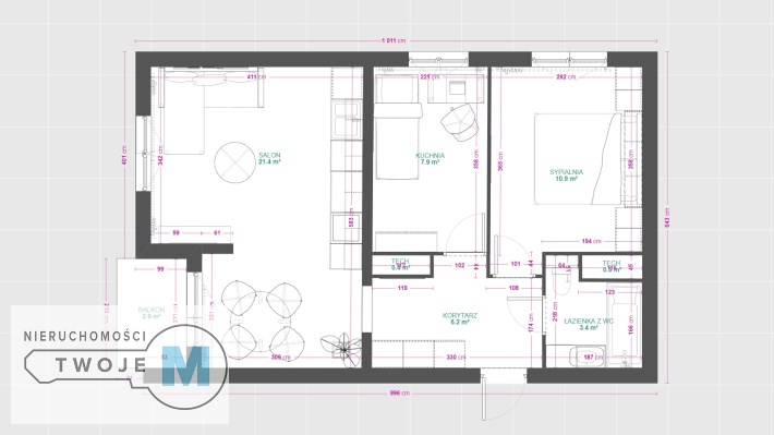 - salon z aneksem kuchennym 21,4m2 z wyjściem na balkon o powierzchni 2,9m2