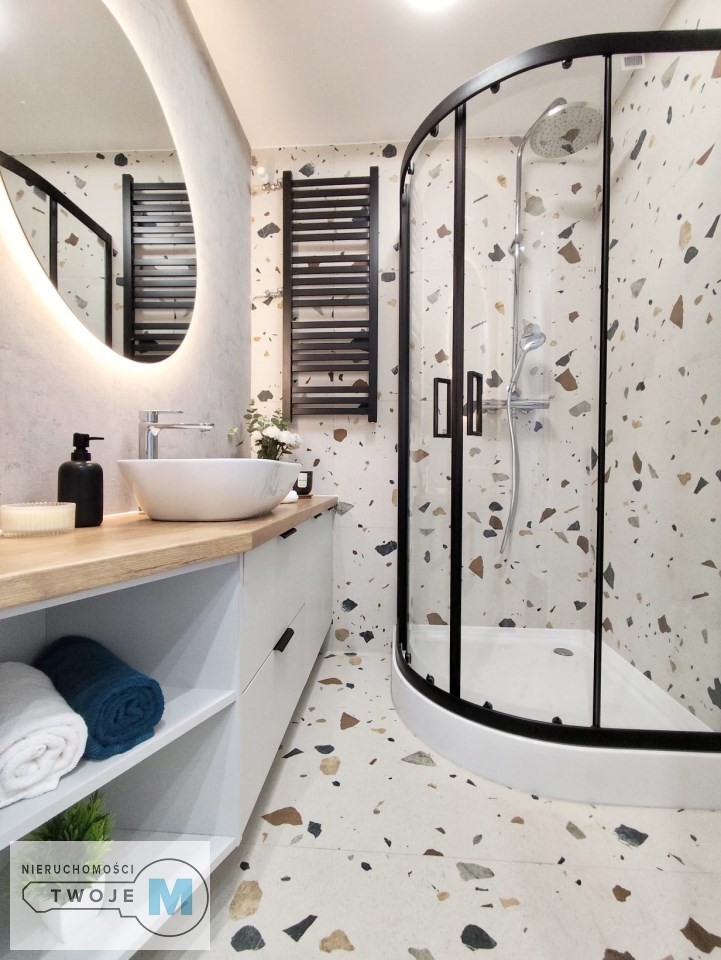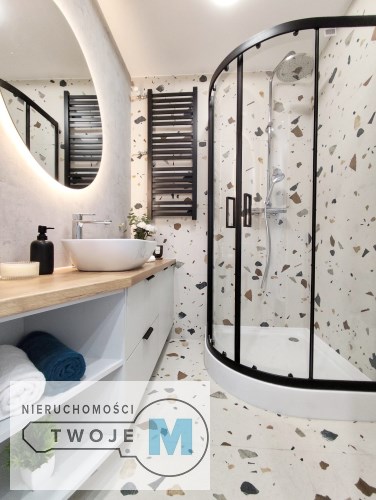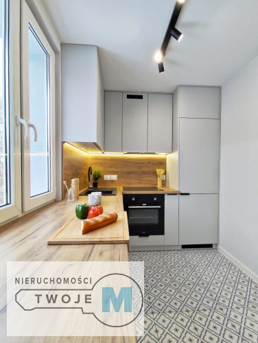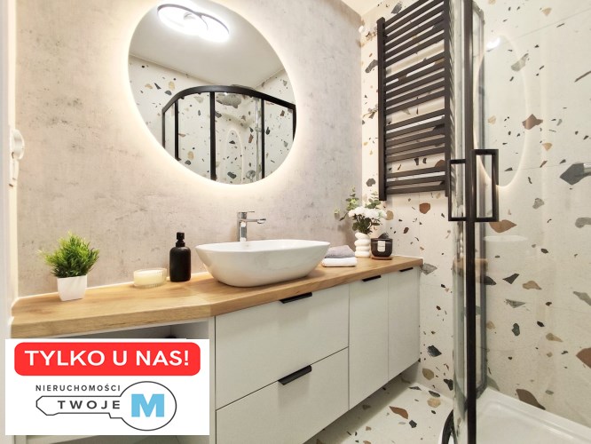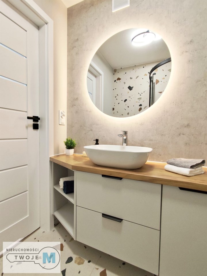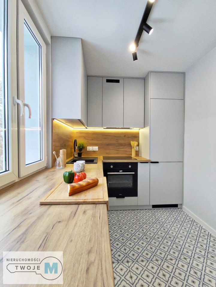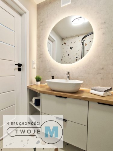 W mieszkaniu znajduje się duża, funkcjonalna, widna kuchnia, w której została wykonana wysokiej klasy zabudowa meblowa przez stolarza. Zainstalowano wszelkie niezbędne sprzęty AGD znanych marek tj.: okap, piekarnik elektryczny, płyta indukcyjna, lodówko-zamrażarka oraz zmywarka. Łazienki w mieszkaniu zostały zaprojektowane w nowoczesnym stylu. Zainstalowano w nich wysokiej klasy armaturę oraz energooszczędne i modne oświetlenie LED. W przedpokoju znajduje się wysokiej klasy szafa z lustrem w zabudowie wykonana przez stolarza na wymiar. Do wykończenia mieszkania zostały użyte wysokogatunkowe materiały w nowoczesnym dizajnie: świetnej jakości farby w jasnych kolorach, panele o wysokiej klasie oraz energooszczędne i modne oświetlenie.
