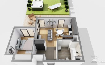 Dodatkowym wyróżnikiem jest ogród zimowy, harmonijnie wkomponowany w bryłę mieszkania. Dzięki przeszklonej, składanej zabudowie możesz korzystać z tej przestrzeni przez cały rok, dostosowując ją do warunków pogodowych.