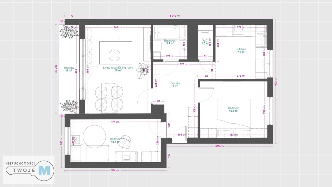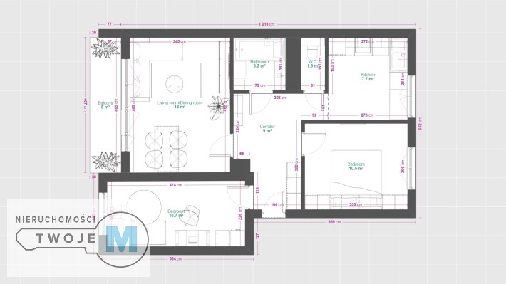 - duży, widny pokój dzienny z wyjściem na balkon – 16 m2