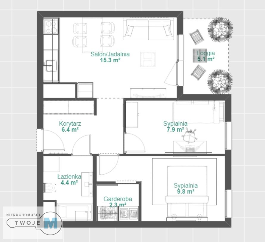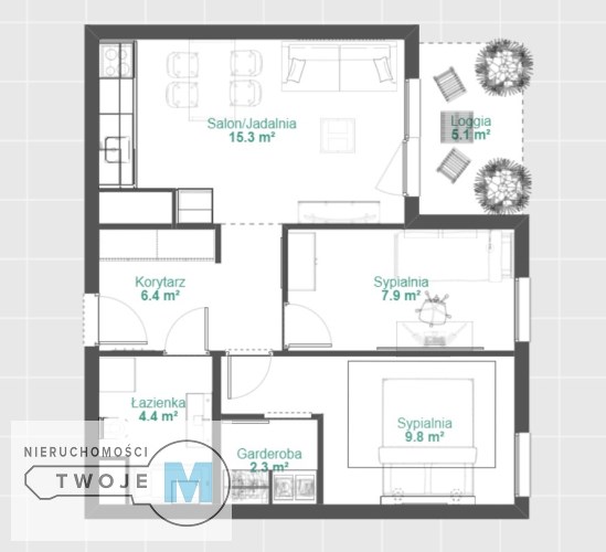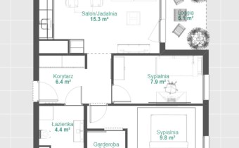 - salonu z aneksem kuchennym z wyjściem na balkon typu loggia (5,1m2) - 15,26 m2,