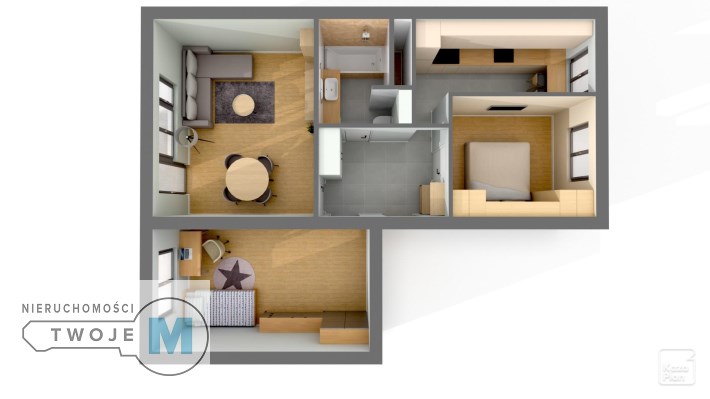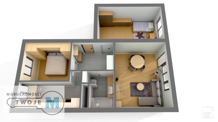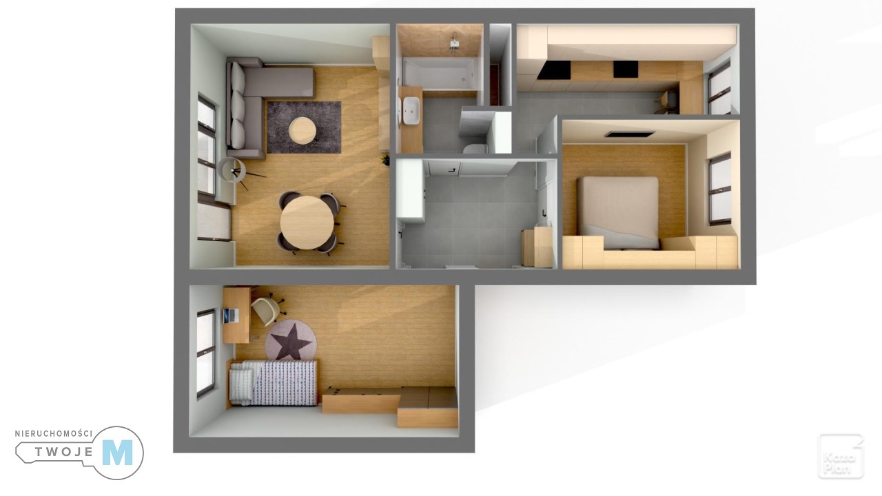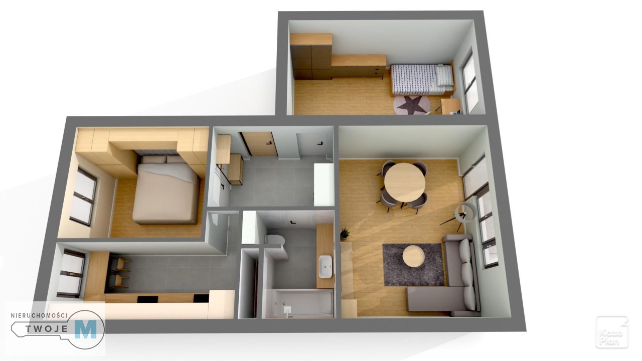 - trzy ustawne pokoje - 17,5m2, 14,5m2, 9,5m2