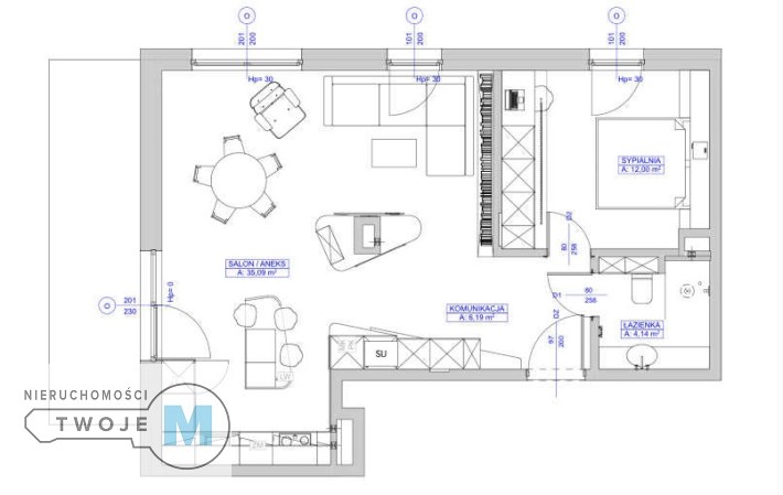- salon z aneksem kuchennym - 35,09m2