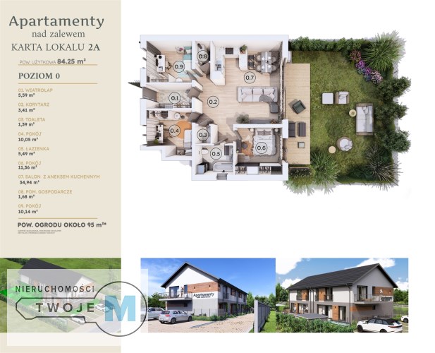 Lokale dostępne są w dwóch wariantach: apartamenty na dole o powierzchni ok. 84 m² z dużymi prywatnymi ogrodami lub apartamenty górne o powierzchni 91,5m² z mniejszymi ogródkami oraz dodatkową przestrzenią na strychu. Każdy lokal posiada jedno lub dwa miejsca parkingowe. Można wybrać wygodny apartament dokładnie dopasowany do swoich potrzeb.
