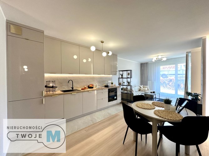 - przytulny salon połączony z aneksem kuchennym z wyjściem na prywatny ogródek
